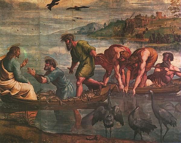 Dopo essere stato cacciato da Nazareth, che era la sua città, nostro Signore si era ditretto a Cafarnao, che da allora sarebbe stata la base della sua attività. Trovatosi premuto dalla folla, aveva cercato rifugio in una barca, che apparteneva a Simone. Scostatosi un po' dalla riva, aveva cominciato a parlare alla folla. Quindi, dopo aver finito, aveva pregato Simone di spingersi al largo e di gettare le reti. “Va al largo e cala le reti per la pesca”, gli aveva detto.