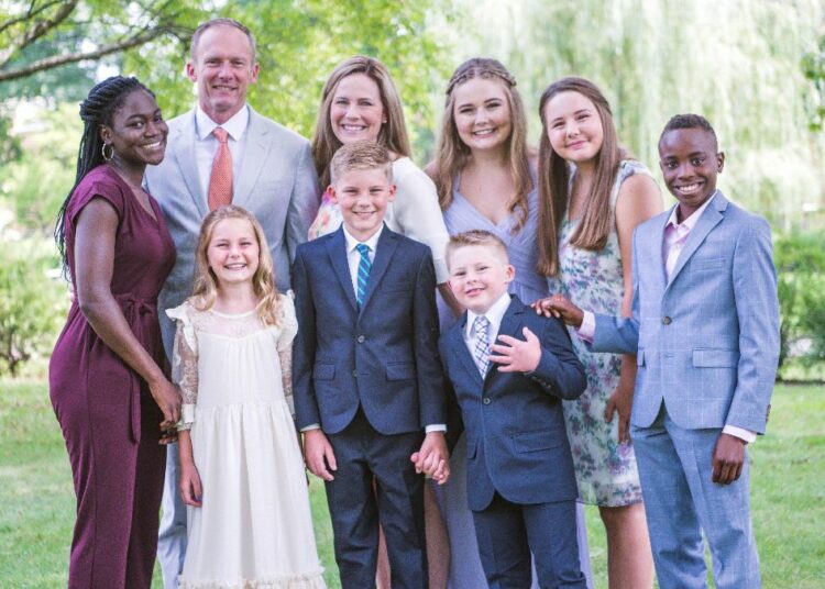 In questa foto, scattata non sappiamo quando, ma non molto tempo fa, il giudice federale degli Stati Uniti Amy Coney Barrett è ritratta con il marito Jesse M. Barett, avvocato, con cui è sposata dal 1999, e con i loro sette figli: Emma di 19 anni, Vivian e Tess di 16, John Peter di 13, Liam di 11, Juliet di 9 e Benjamin di 8. Due, neri di pelle, come il carbone, in questa famiglia di bianchi smaglianti, sono stati adottai ad Haiti, dopo il terremoto che ha squassato l’isola nel 2010: John Peter quando aveva tre anni e Vivian a 14 mesi, ma la piccolina era così malata che i medici non erano certi che avrebbe mai camminato e parlato. Mamma Amy, il giudice, ora dice che Vivian parla benone. Il più piccolino dei figli biologici di Amy e Jesse è affetto da sindrome di Down, «Ben», quello che nella foto c’ha più la faccia da «Pierino» di tutti.